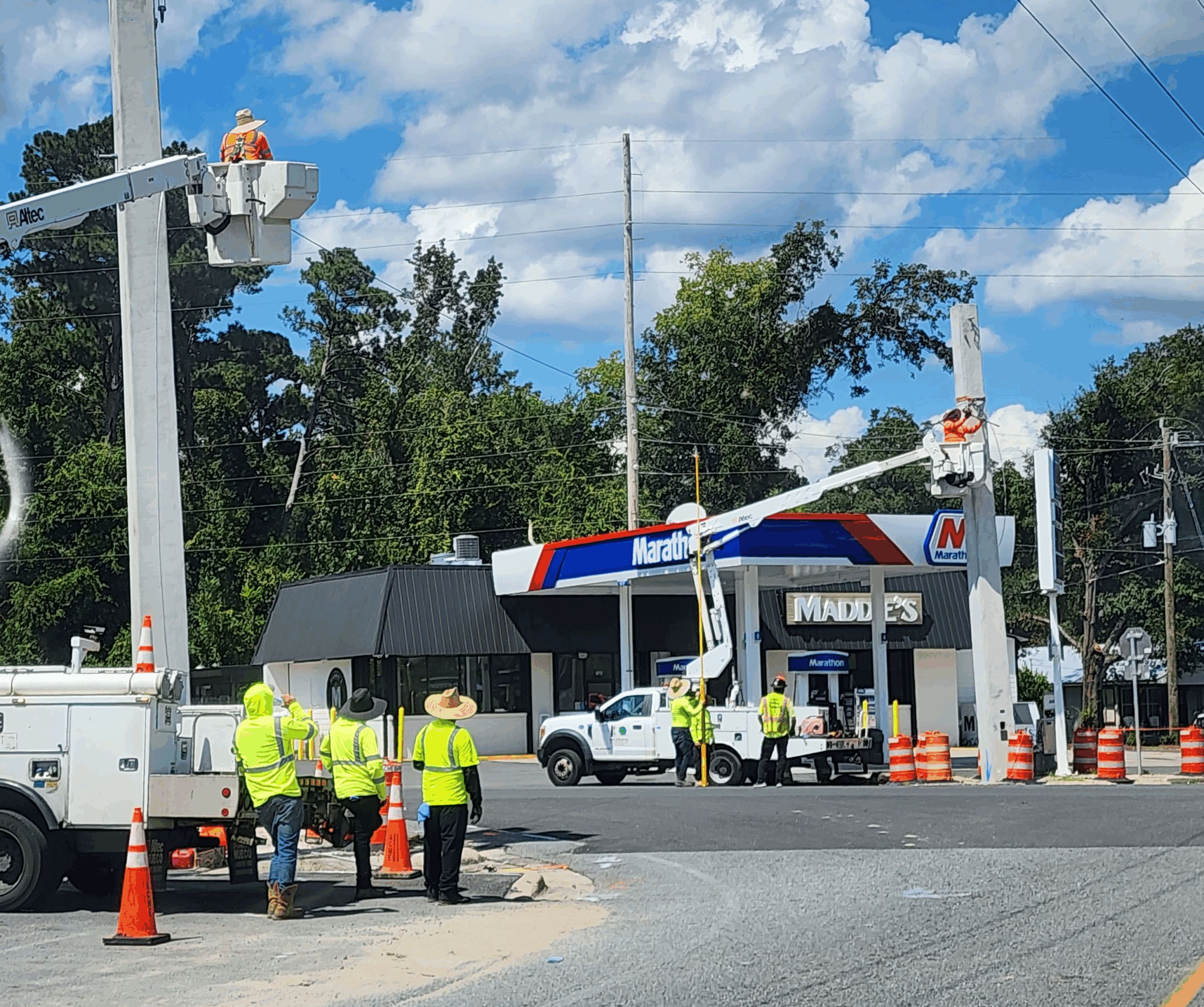 HOSFORD, FL – Work is progressing on the installation of a four-way traffic signal at the intersection of SR 20 and SR 65 in Hosford.  Bucket trucks flanked SR 20 last Thusday as crews pulled a cable across the road while workers paused traffic.