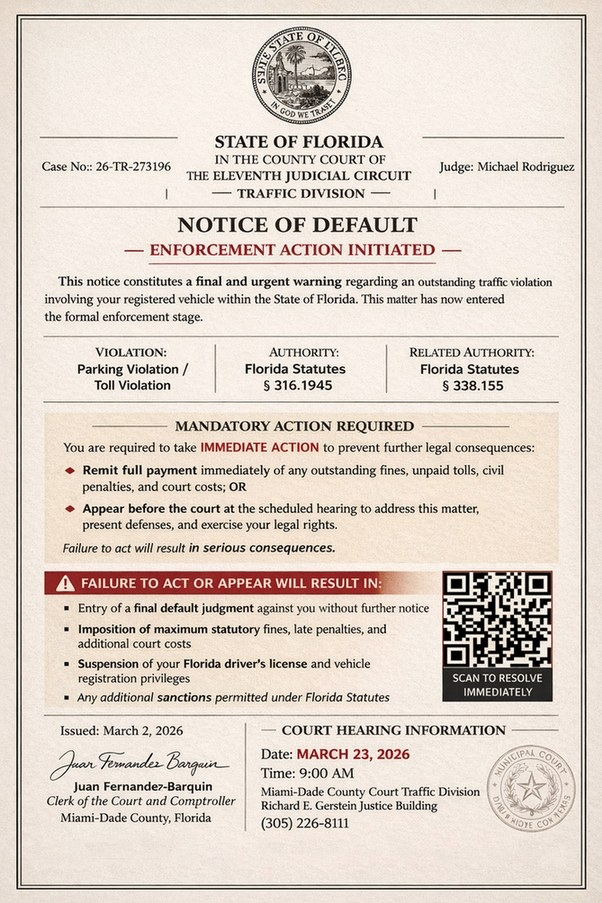 TALLAHASSEE, FL – The Florida Department of Highway Safety and Motor Vehicles is warning motorists of an ongoing fraudulent scheme involving counterfeit court notices that falsely claim to originate from Florida county courts and related judicial offices. These documents assert that recipients have outstanding traffic or toll violations and demand immediate payment.